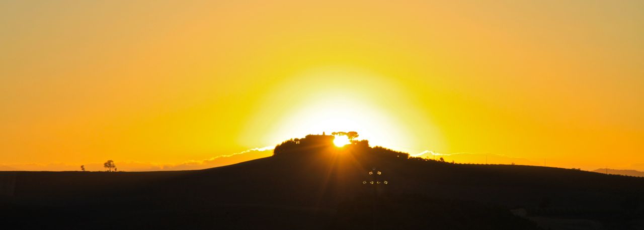 Sulle leggiadre colline della Val d'Orcia, l'atmosfera si fa struggente, con il sole che le infuoca dei suoi ultimi bagliori.